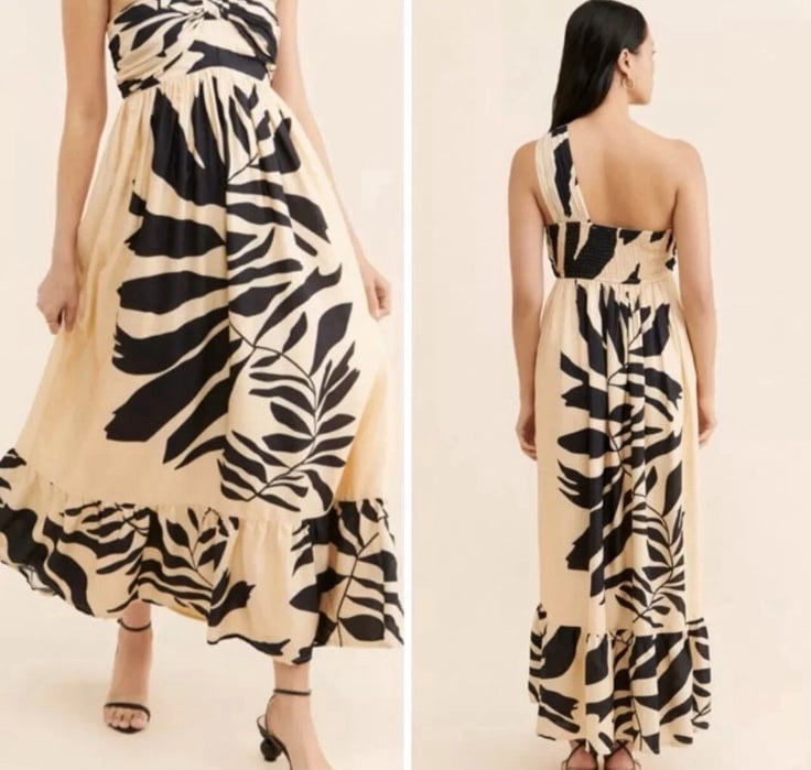 New! Anthropologie Let Me Be One-Shoulder Maxi Dress, small<br><br>One-shoulder floral printed maxi dress with smocking at the back<br><br>Pullover styling<br><br>Imported<br><br>100% viscose<br><br>Hand wash cold<br><br>Lined<br><br><br>Label has a line through it to prevent returns
