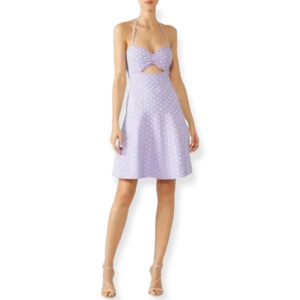 Picturing the RONNY KOBO Shila Dress Lavender Polka Dot Mini Halter Large L<br><br>* Brand Name: Ronny Kobo<br>* Size: Large L<br>* Color: Lavender with white polka dot print<br>* Retail Price: $398<br>* Approximate Measurements (taken while garment laying flat and NOT STRETCHED OUT to full length). Dress is a rayon blend and has stretch to it:<br>- Across (armpit to armpit): 14”<br>- Waist: 13”<br>- Length (shoulder to bottom hem): 32.25”<br>* Condition: Dress has some very minor pilling and pulls (see pic for details). Not noticeable but need to disclose prior to sale. Otherwise, very good used condition. No rips, stains, or tears. Smoke Free, Pet Free Home<br><br>Items purchased before 3pm Monday to Friday and 12pm Saturday are shipped same day. Items purchased outside of these times are shipped within 24 hours; late Saturday and Sunday purchases are shipped the following Monday.<br><br>RONNY KOBO Shila Dress Lavender Polka Dot Mini Halter L